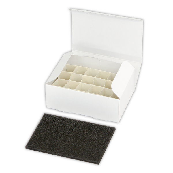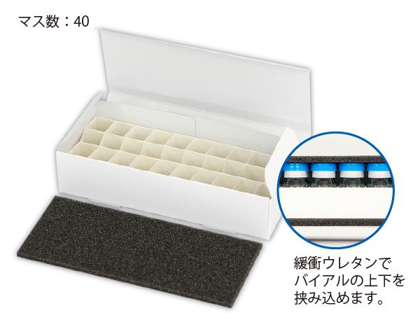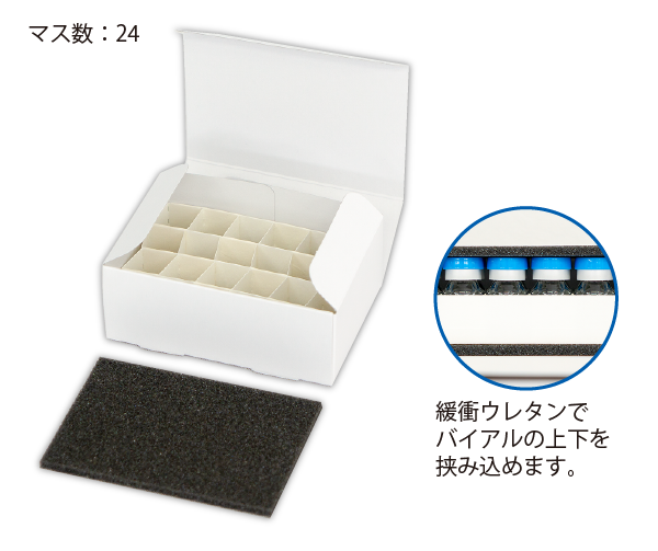 - 衝撃を和らげるために緩衝ウレタンでバイアルの上下を挟み込めます。