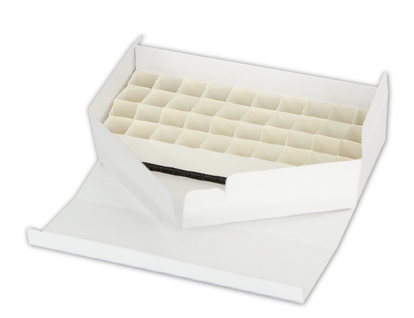 ファイザー社製新型コロナウイルスワクチンのバイアルサイズ【直径16.25mm】に合わせて設計した使いきりで衛生的なフタ付きバイアル収納箱です。衝撃を和らげるために緩衝ウレタンでバイアルの上下を挟み込めます。24本用と40本用の2種となります。